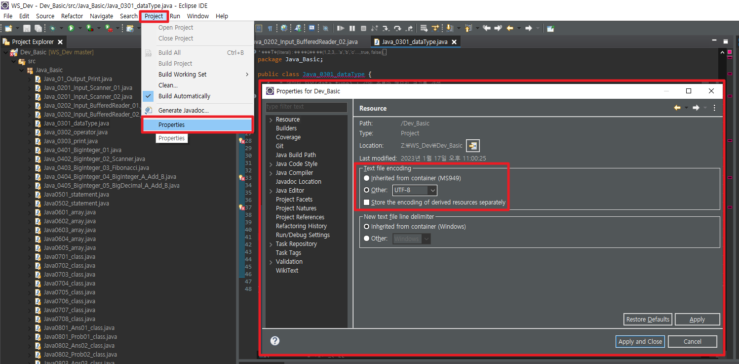 좌측 Resource > Text file encoding에 어떤 인코더가 설정되어있는지 확인한다.