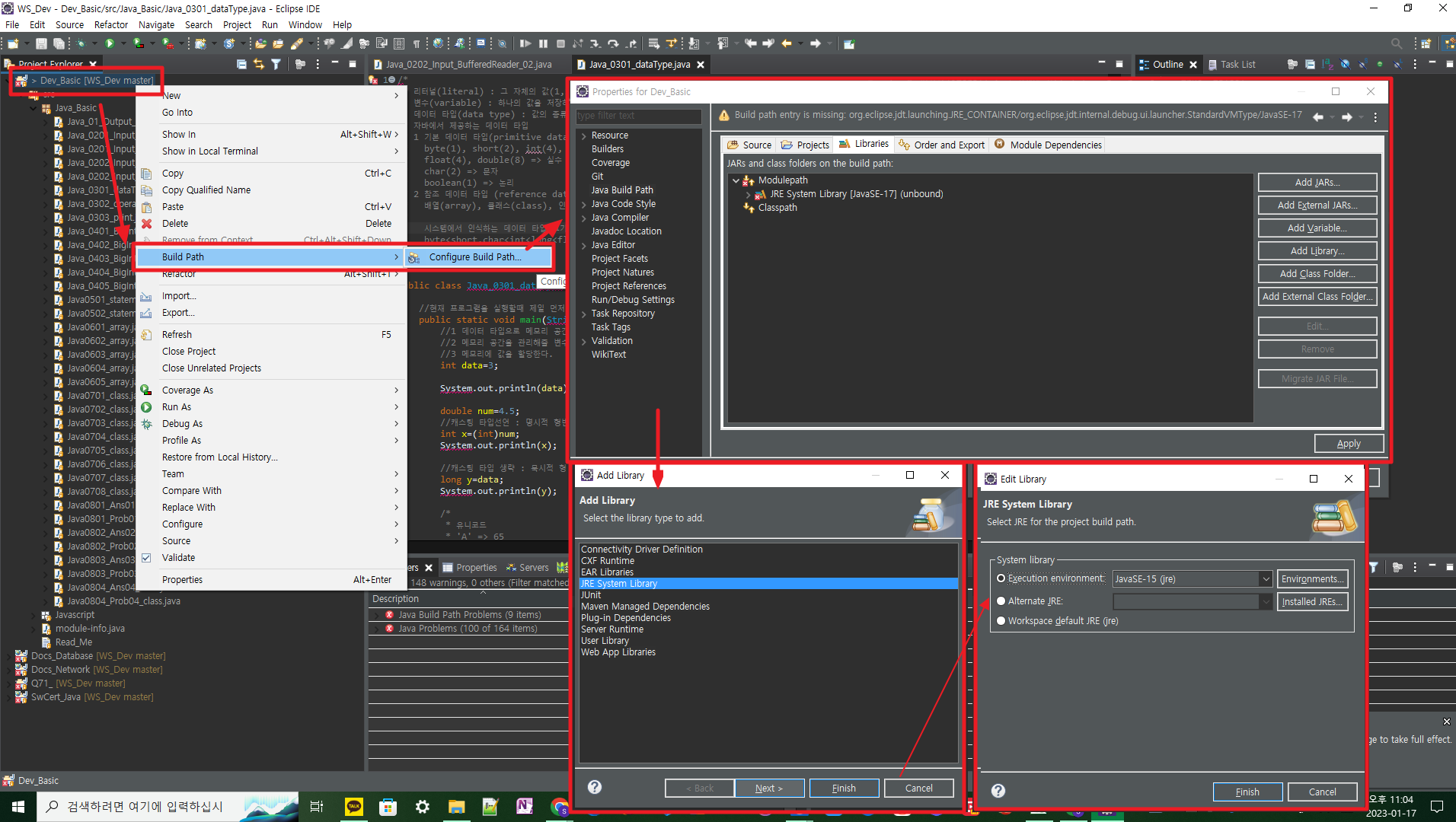 프로젝트 우클릭 > Build Path > Configure Build Path 클릭하여 "Build Path 설정 메뉴" 열람